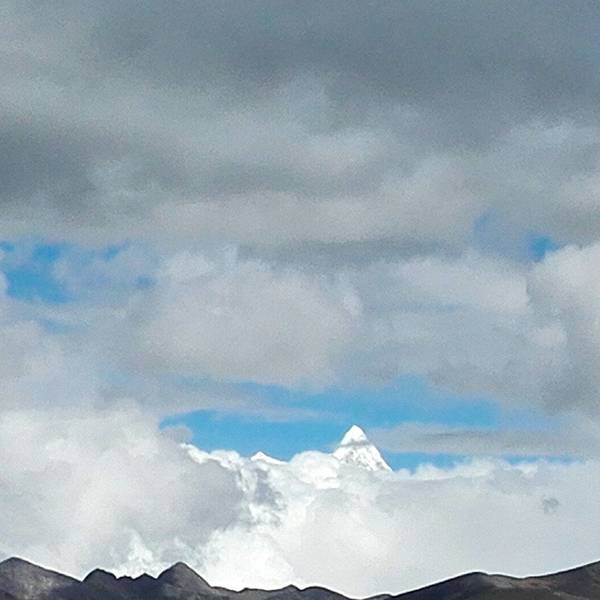 本来早上晴空万里,但一到中午就起云,这就是高原。我们刚到山口的时候,南迦巴瓦是这样的:南迦巴瓦被称为“羞女峰”,十人九不遇,一个月中至少有20天是连雪山脚都看不到的,就是因为她身在水汽充足的 林芝 地区。