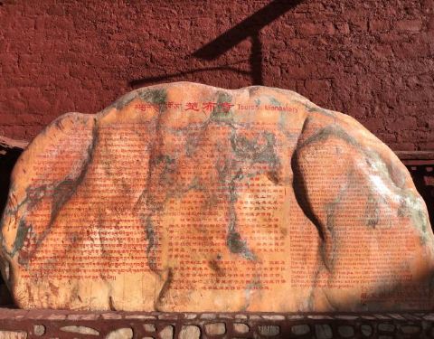 楚布寺位于拉萨以西60公里堆龙德庆县西北楚布河上游,由第一世大宝法王杜松虔巴于1189年建立,是噶玛噶举派的主寺,历辈噶玛巴活佛驻锡之地。年迈的第一世噶玛巴都松钦巴在这里把预言自己转世的信亲手交付给弟子卓衮德千,创造了举世瞩目的西藏活佛转世制度。楚布寺坐北朝南,三面环山,以杜康大殿为中心,主殿四周环绕着4个扎仓,合以经堂、神殿、僧舍及河南岸高大的展佛台等建筑,组成一座雄浑壮观的古老佛寺。寺门前是一个大广场,广场中央矗立着一方石碑“江浦建寺碑”,此碑立于9世纪墀祖德赞时期,是楚布寺悠久历史的佐证,更是研究吐蕃时期政治、经济、宗教、文化不可多得的重要历史资料。沿着广场的24级台阶走上去便是楚布寺的主要建筑“杜康大殿”,大殿高三层,正方形布局,由经堂和佛殿组成,是全寺僧侣集会、诵经的主要场所。经堂内装饰华丽,四壁绘有十六罗汉等壁画。从经堂后拾级而上是桑杰多贡佛殿,殿中央供有释迦牟尼、无量寿佛和第十六世噶玛巴活佛的塑像。佛殿两旁为通壁大佛龛,龛中供奉着一千余尊佛像,殿侧有第十六世噶玛巴活佛的灵塔。杜康大殿第二层为大经堂天井,靠南边有第十七世噶玛巴活佛为朝拜信徒摸顶的房间。大殿第三层主要是第十七世噶玛巴的卧室和摆满各种佛教经典的藏经室,又称“贝卓越康”。楚布寺西侧有两座金银包裹的白塔,相传为楚布寺大师都松钦巴所建。前塔为方形塔座,上为宝瓶状塔身;后塔的塔座、塔身皆为方形,形制古朴。寺背后的加日吐切琼博山腰处,有一座白色建筑物:卓康,是楚布寺僧人修炼之处。都是值得一逛的地方。楚布寺拥有大量稀世文物,第八世噶玛巴为纪念其上师而塑造的银像是楚布寺镇寺之宝,传说银像塑成之后竟自动悬浮空中达七天之久,故有“空住佛”之称。此外,二世噶玛巴所铸的楚布拉千(即大佛)、玛恰噶拉石刻塑像、米拉日巴曾用过的钵、都松钦巴的僧帽等都是楚布寺弥足珍贵的宝物。