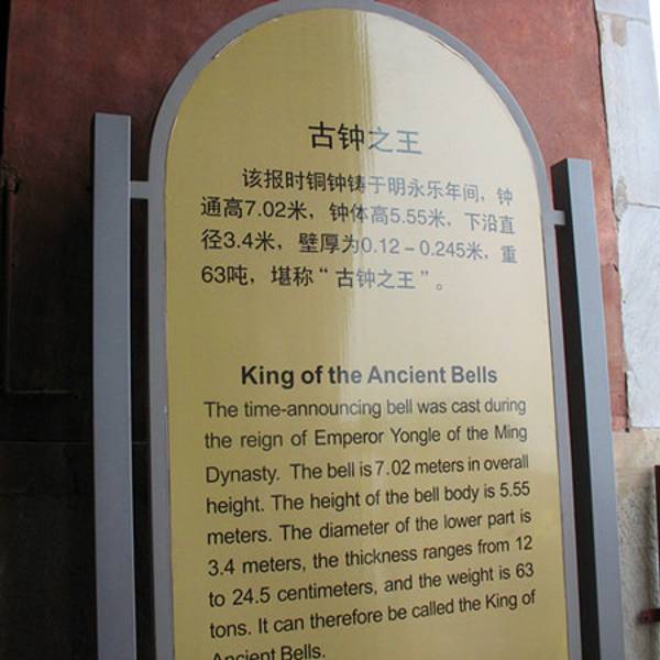 金骆驼 95米,在上面风很大,在上面看景色的时候大家要注意安全。门票可以和鼓楼一起买比较实惠北京钟楼算是老北京中轴线上最北端的建筑了,钟楼和鼓楼比起来显得很高大,但是灰墙绿瓦的建筑没有鼓楼红墙那样好看。钟楼之上悬挂着一口铸于明朝永乐年间的大钟,它高5米有余,直径3米有余,重量有40多吨,原先...北京钟楼算是老北京中轴线上最北端的建筑了,钟楼和鼓楼比起来显得很高大,但是灰墙绿瓦的建筑没有鼓楼红墙那样好看。钟楼之上悬挂着一口铸于明朝永乐年间的大钟,它高5米有余,直径3米有余,重量有40多吨,原先钟楼内悬挂的并不是这口钟,而是同样为永乐年间所铸的一口大铁钟,但因为音质不佳,后来才改用这一口铜钟。大钟曾经是老北京每天报晨的,在1924年后,和鼓楼的大鼓一样,废弃了,但现在已经成为了古物。在我国古代,曾经将一夜定位五更,那个时候老北京起更的时候,便鼓声响,钟声起,城门闭,就这样曾经周而复始无数个日日夜夜...钟楼很高,为重檐歇山顶建筑,通高47.95米,在上面风很大,在上面看景色的时候大家要注意安全。现在钟楼二层外廊已经不允许游客行走用护栏围起来了,但是站在护栏之内还是能看到很多北京城的风景,远处的北海、什刹海、德胜门,近处的一个个京味小吃店和北京城著名的胡同,这些都是老北京原汁原味的特色。来到北京旅游,建议走一走这著名的中轴线,尤其是钟鼓楼一定不要错过,在这里可以感受到真正的“老北京”。我在钟楼的时候还看到了很多外国的朋友前来在此游览。建议游览时间,一个小时。门票可以和鼓楼一起买比较实惠。钟楼就位于鼓楼北面不到一百米的地方,如果坐地铁的话,建议在鼓楼站下,乘坐地铁2号线,在鼓楼大街下车B出口,乘公交车的话:5、60、107、124、734、834、815、819路在鼓楼站下车,往南就是钟楼。从钟楼下来可以往南走去烟袋斜街逛一逛里面有很多著名的小店铺,或者在什刹海周边尝尝北京的小吃,还可以再去景山公园看一看这里关门很晚,这些景点可以放在一条线来玩。 展开