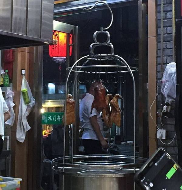 老北京时,上烤鸭店去吃烤鸭,不仅是好吃,而且亦会使你感到很痛快,由你自己选定肥鸭,的就拿下楼去烤,烤熟以后,由一位大师傅端上楼来;烤好的肥鸭,皮呈红紫色,油汪汪的,大师傅当面给你切片。