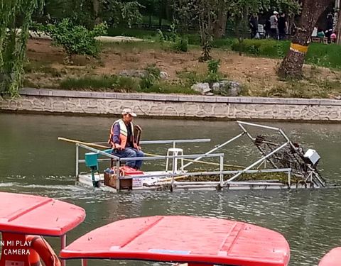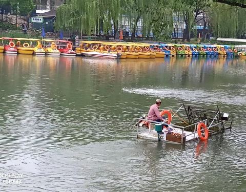 近段时间青年湖公园的湖水里水草疯长,开始是工人用长竹杆上梆一个镰刀,划着小船进行人力清除水草,...青年湖使用机械船除水草,近段时间青年湖公园的湖水里水草疯长,开始是工人用长竹杆上梆一个镰刀,划着小船进行人力清除水草,费时费力,近期使用了机械船进行清理水草提高了工作效率,还青年湖一个干净的水面。