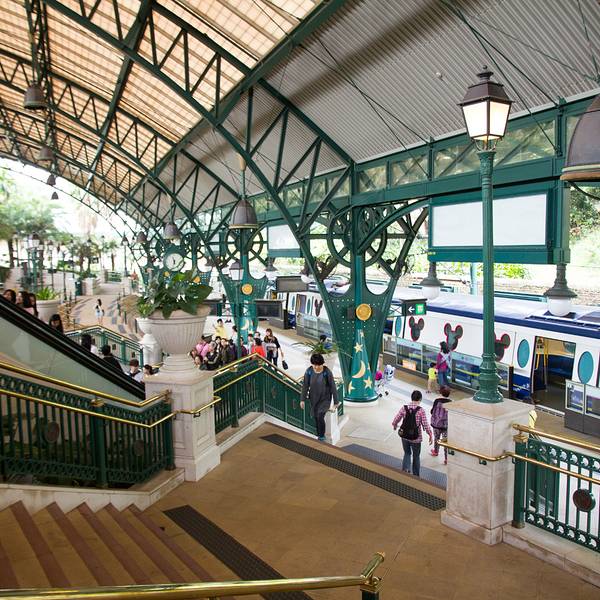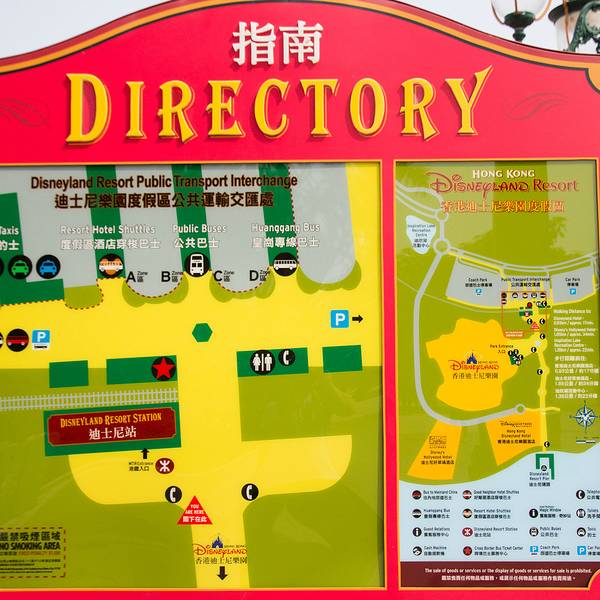 香港迪士尼乐园座落于大屿山,多种交通工具均可到达。香港迪士尼乐园公共运输交汇处是各类型交通工具的交汇点,无论乘坐港铁,巴士,的士,旅游巴士,或自行驾车,均十分方便。 在巴士总站及的士上客区/落客区均设有轮椅使用人士的候车处、凸字地图及凹凸纹引导径,以方便有需要的宾客使用巴士及的士服务。