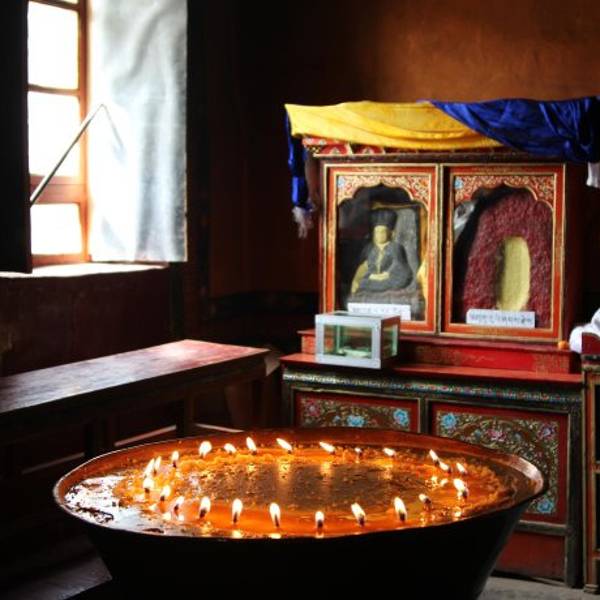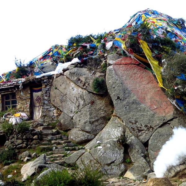 在半山腰还有一处叫这“文则拉康”的尼姑庵,是由喇嘛丹增和尼姑德钦主持的。据说丹增曾是医生,德钦曾是两个孩子的母亲,他们来自青海两个不同的家庭,双双离家,又双双出家,四处流浪,还去过印度,最终选择了青朴作为终点。开始的时候他们也是栖身在洞穴里面修行的,经过漫长而艰难的苦心经营,终于建造了现在这所寺庙。现在寺庙里已经有90多位尼姑,不仅自己读经念佛,也为山上的修行者提供一些帮助。离尼姑庵不远有一处已经有1000多年历史的修行人洞穴,洞穴口按了一扇简易门。从门缝望去,洞穴不大,点着酥油灯,有一些佛像和生活用品,但已经没有修行者,只是供参观的。从洞穴下来,正赶上尼姑庵准备做下午诵经,2个尼姑吹起法螺,声音悠扬深远。在桑耶寺赶上吹大法号,在尼姑庵又赶上吹法螺,也是一种缘分吧。 展开