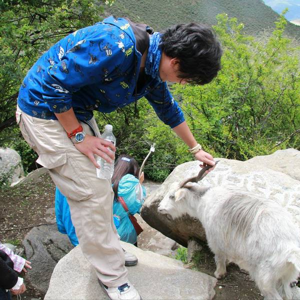 途中,遇到了5位藏族的姑娘来此朝圣。5位姑娘热情地邀请我和他们一同进餐。尝了一口清茶,咸咸的。虽然味道不习惯,但是这种茶很适合运动出汗后补充水分和盐分。聊天中得知,那几位姑娘来自西藏各地,有林芝的,有山南的,有日喀则的。她们都在贡嘎机场上班,所以汉语和外貌打扮都还不错。但是没想到的是,之后的几个小时里,这5个女孩让我见识了什么叫做站在食物链顶端的女人……