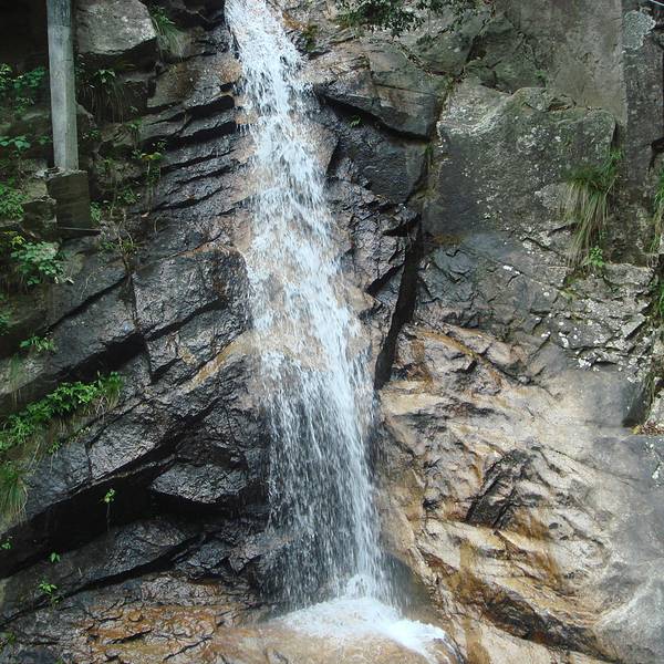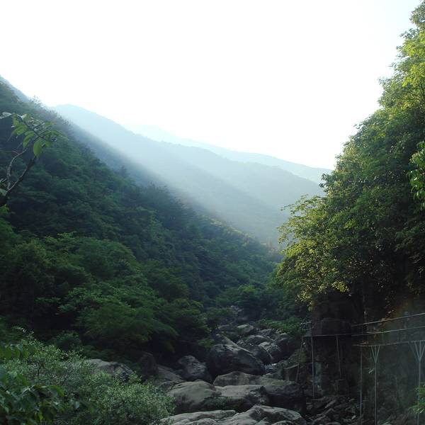 进入景区,需要排队乘坐景区公交车前往景区入口。乘坐缆车与徒步登山的入口不在一个地方,排队时有标志,右侧是徒步登山队伍,左侧是乘坐缆车的队伍。沿着台阶一路上山,到山顶一共用了2个小时,台阶都是沿着一条溪流修建,全程都有叮咚的溪水相伴。山上流下来的溪水清澈冰凉,爬山出了一身汗,可以在这里洗一把脸。有几段台阶还是很陡峭的,爬到中间需要停下来休息一下。中午的气温有三十多度,一路上不停的流汗,一定要多喝水。到山顶一共要经过三座桥,一座索桥大概位于半山的位置,大部分的游客到这里还是体力充沛,在桥上不停的摇来晃去,传来一阵阵惊呼声。