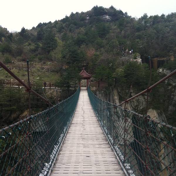 缆车到达山顶,便能看到大明湖,步行山上直接看到索桥。