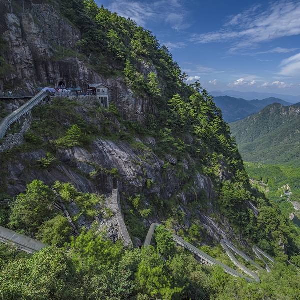 3、还有特别刺激的体验,山顶上是悬空栈道,悬崖峭壁上的游步道,前面有几个恐高的人是趴在石头上过的;哈哈哦。我们坐滑滑梯下山的,超级大的滑梯非常刺激好玩,据说是华东地区最长的旱滑道。刺激是不是又是一爽呀?。。。。