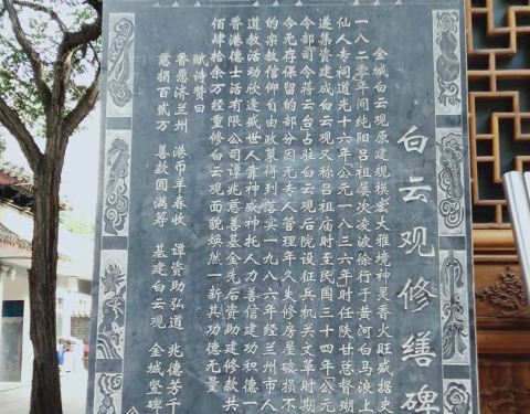 白云观也叫吕祖庙,始建于清道光十七年(公元1837年),是由陕甘总督瑚松额捐俸修建的,也是古代兰州三观之一。白云观山门额雕“升云得路”,门楣悬邓宝珊所题“白云观”木匾。观内供奉有吕洞宾的塑像,有东西望河楼、戏楼以及前、中、后院等一组三进的建筑群,两侧为云水堂、钟鼓楼、道院等。后殿有花园、八仙阁潇洒轩、鹤鹿亭、来仙亭、聚仙亭、群仙楼等建筑,古香古色,道教风格浓郁。白云观,殿堂建筑雄伟,香火旺盛,道教文化气氛浓厚,在当地可谓独具风貌,观内7颗国槐参天挺拔,枝繁叶茂,使白云观更显清净优雅,1997年兰州市人民政府将这7颗国槐作为重点古树名木挂牌保护,成为全城仅有的一处名胜道观与古树名木融为一体的景点。近20年来,兰州白云观已成为荟萃十方全真道士和联络全省正一派道士以及信教群众开展宗教活动的中心场所。同时,也是海内外道教信徒及游人观光朝拜交流的道观。近年曾先后接待过美国、日本、新加坡等国的参观团参访朝拜及文化交流活动。每年来这里敬神参观的香客游人达20余万人次,成为展现道教传统文化风貌、增进学习交流和友好往来的重要窗口。漫步在游人如织的滨河路,凝视白云观色泽古旧的山门,以及从观内徐徐升起的香烟,让人顿生几分“此地有仙山”的感慨。白云观,作为黄河风情线上一座有着仙家氛围的古观,将长久地吸引着南来北往的信众和游人,在此驻足、流连。