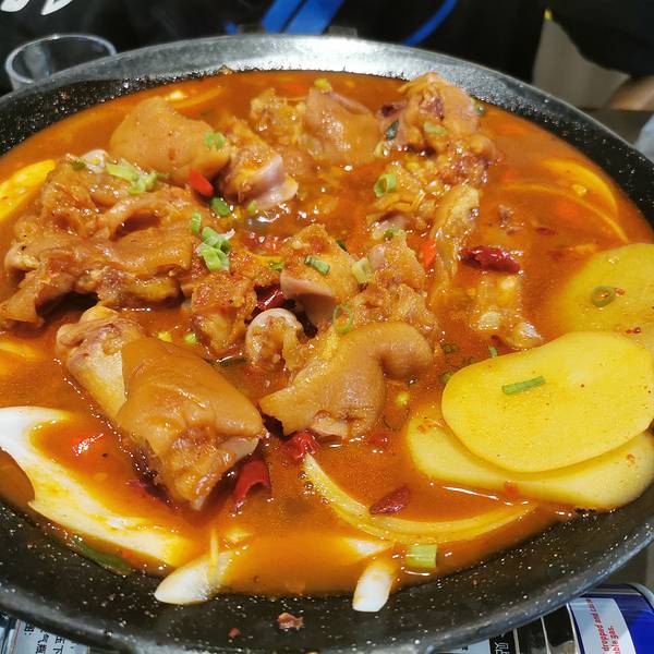 沿着坡路向上走,有的健身,有的遛弯,有的遛鸟,还有专用健身跑道,大家悠悠闲闲生活节奏很平和。人民公园一角,估计再有一个月荷花满堂更漂亮从公园西侧出来有一家公寓楼,上电梯三楼有一家雪冰咖啡,店面干净雅致又温馨,她家的打糕雪冰味道很特别,冰冰沙沙的,还有豆粉和小的打糕块在里面,丝丝甜甜的很有特色,在大众点评上可以团购,价格有优惠。出来甜点店,继续延大方向前行,人行道一侧有很多商家小店,路上学生和行人很多,看到一个女孩子拿着梅菜扣肉饼,我的最爱啊,找找哪卖的。延大正门对面有一条小街,附近小吃店很多,卖梅菜扣肉饼的小店就在这,离街口大约10米距离。小店不大,门口排队,点餐一侧,取梅菜饼一侧,还有和饮料一起的套餐,我们排了大约20分钟,终于可以吃到啦,火候有些偏大,吃起来脆脆甜甜的,和在家里的味道一样,没有特别。延大对面的网红墙延大一侧继续往前走,路边漂亮的小店叁代家猪蹄拌面家在二楼,一楼街面很小的一个走廊可以上楼。点了她家招牌猪蹄拌面和鱼皮土豆片,外加一份草莓米酒,消费170元。女儿美食攻略里的叁代家猪蹄拌面猪蹄拌面是一份加热的小锅菜,先吃里面的猪蹄和蔬菜,然后再放面条(手擀面),吃多少加多少,否则汤汁太粘稠菜的口感就不好了。鱼皮土豆片里面的鱼皮酥酥脆脆,很好吃,土豆片有的脆脆的,吃起来艮艮的,想来叁代家的可以选择性点这道菜,我们这道菜没吃完,但是也打包带走了,希望下一位点这道菜的客人可以品尝到更新鲜的土豆片。草莓米酒很好喝,可以过来尝尝。猪蹄拌面底汤,下面加热,猪蹄软烂入味,味道很好鱼皮土豆片,味道还可以,甜丝丝的,就是感觉土豆片没那么新鲜这一顿吃下来胃里什么也放不下了,继续溜达晚上还有一餐呢😂顺着延大正门对面街往回走,街上行人不少,右手侧还有一些小店铺可以顺便逛一逛,大约步行40分钟到西市场。