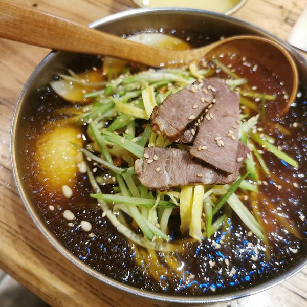 从时代广场出来回酒店送东西,顺便休息一下,晚上在离酒店不远处(步行最多10分钟)有一家河坝烧烤,准备在那解决今天的晚餐。提前电话预订座位,18点准确时过去,店里人还没满,大约一半的上座率,看来这个时间过来还好,昨晚我们大约21点回来他家都是客满状态。店里是碳火自己烤肉,桌子中间有一个小槽子,排风系统还不错,烤的时候几乎没有油烟。我们点的菜里面,冷面、秘制羊肉小串、牛肉小串、甜香烧烤串、干豆腐香菜卷、土豆饼、米酒,口感都不错,共消费168元。冷面口感真心不错,还带冰沙的 展开