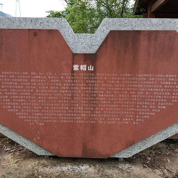 下午搭公交至紫帽山下車,走登山步道到山腰涼亭休憩 (步道設計比較古式,大石塊組成崎嶇不平,適合布鞋走路),涼亭裡有提供泡茶器具、現炒小吃的服務,之後往山頂走到凌霄塔,山頂的景色能眺望晉江泉州地區,下山選擇車子行走的道路比較好走。入口爬到山腰有個大涼亭可休憩,商家提供泡茶、小吃等服務涼亭往天氣塔遙望往山頂路上的小涼亭石雕山頂一望無際凌霄塔說明凌霄塔山頂小涼亭,徐徐吹來的風,很舒服