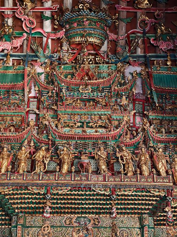 接下来,我们踏入了广胜寺。这里分为上下寺,上寺的飞虹塔是1986年版《西游记》的取景地,它的琉璃装饰熠熠生辉,随着夕阳的余晖,层层光影交错,美得让人窒息。下寺也是个意外之喜,我们在17点多抵达的时候才意识到下面的水神庙。虽然光线昏暗,但用手机拍出来的夜景,却意外清晰,展现了元代壁画的魅力。