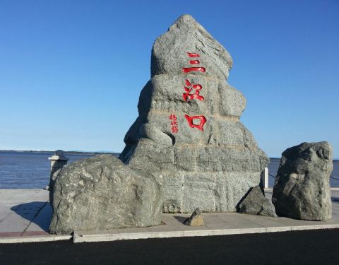 松花江与黑龙江在同江城东北4公里处的同江汇合,汇合后俗称“混同江”,故名为“三江口”。三江口风景区以“江汇于此、路始于此、海通于此”而闻名。 来到三江口风景区有两个必看:一是欣赏同三公路零公里标志塔的壮美,经过同江市政府的独具匠心建设,这里已成为风景独特的旅游观光宝地;二则是“泾渭分明”的两江奇观。黑龙江水色呈墨绿色,平缓而坦荡;松花江泥沙较多呈黄色,黄色的松花江与墨绿色的黑龙江汇合后的江水汹涌澎湃,水色分明,东流数十里不混。 2米高的标志塔巍峨耸立,直上云霄。标志塔造型别致,寓意深刻。博物馆陈列着赫哲族各个历史时期的生产生活实物,记载着改革开放以来赫哲族生产生活发生的巨大变化。别具一格的水上餐厅可以品尝特色美味,避雨长廊则可以远眺异国风情。同时由于景区内绿化面积大,也被称为“天然氧吧”。