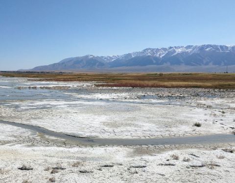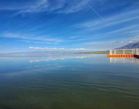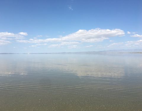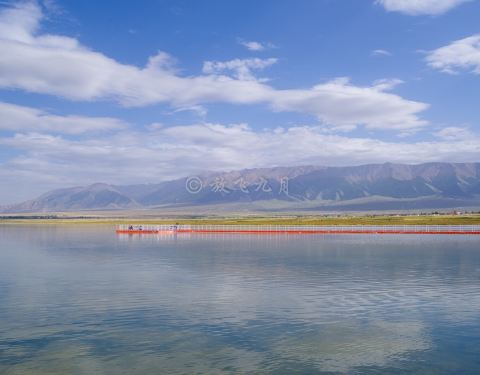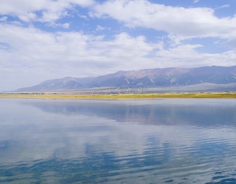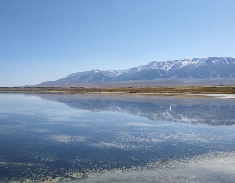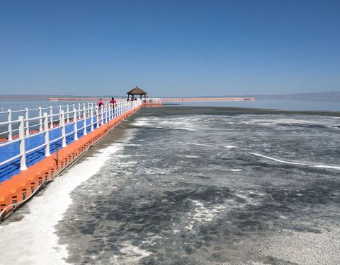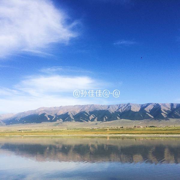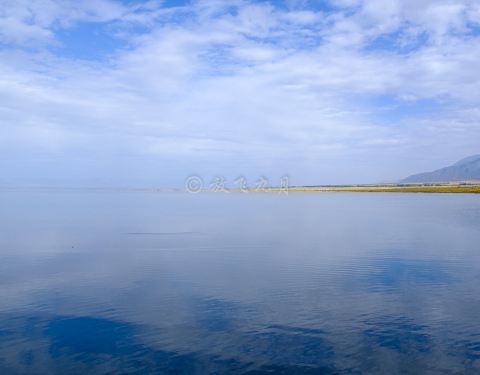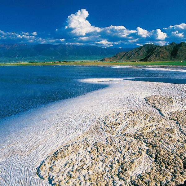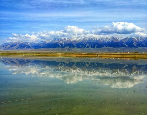 盐湖,风景如画的盐湖,没有风的蓝天下,水很蓝,雪山倒影极美!