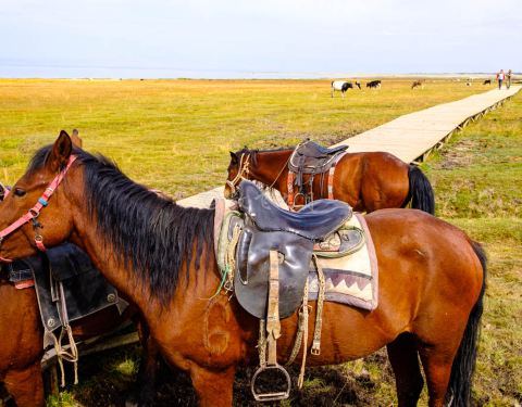 这里味道小,景色也很美,更适合拍照。 如果从马上摔下来,速度又快,那就麻烦了。 所以没骑,直接走了巴里坤湖,真正的正门,是图1. 敲黑板,这个才是正门,是真正景区的正门! 前一晚,我们走错了,到了一公里之外的工业区,所以湖水的味道,特别大。 这里味道小,景色也很美,更适合拍照。 进入之后,是一个很长...巴里坤湖,真正的正门,是图1. 敲黑板,这个才是正门,是真正景区的正门! 前一晚,我们走错了,到了一公里之外的工业区,所以湖水的味道,特别大。 这里味道小,景色也很美,更适合拍照。 进入之后,是一个很长的木栈道,还有一块大石头,写着“巴里坤湖”。 和工业区一样的蓝色浮桥,很美。 天上云很多很厚,所以湖水不是太蓝,通透度不是很好,但有一种朦胧美。 走进湖心,就可以看到工业区那边的橘黄色的浮桥边,是我们昨天走进去的地方。 估计天上如果没有这么多的云,蓝蓝的天,蓝蓝的湖水,一定会特别美吧。 路边有很多马,备好了鞍,给游客骑的。 一来,我们到的时候,已经下午4点多了,还要赶到奇台去,实在没时间。 二来,我看到草地坑洼很多,而且很多大坑,如果地势不熟,策马扬鞭的时候,马真的跑起来,四蹄腾空,很容易摔倒。 如果从马上摔下来,速度又快,那就麻烦了。 所以没骑,直接走了。 马的身上,还有烙印,是号码,可能用来区分吧。 展开