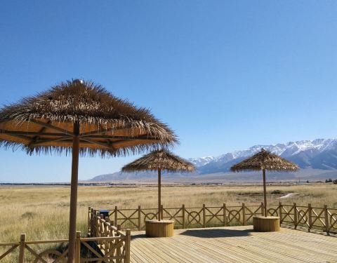 从县城走303省道到巴里坤湖,只需20多分钟。但公路上到湖边的入口有三个,据网上游客介绍,从第一个入口到湖边,同样有浮桥,但湖水己被工业污染,恶臭难闻,根本无法游览。我们从第二个入口进去(即里程碑2703K+100M处的入口),前行约1公里即到景区停车场。