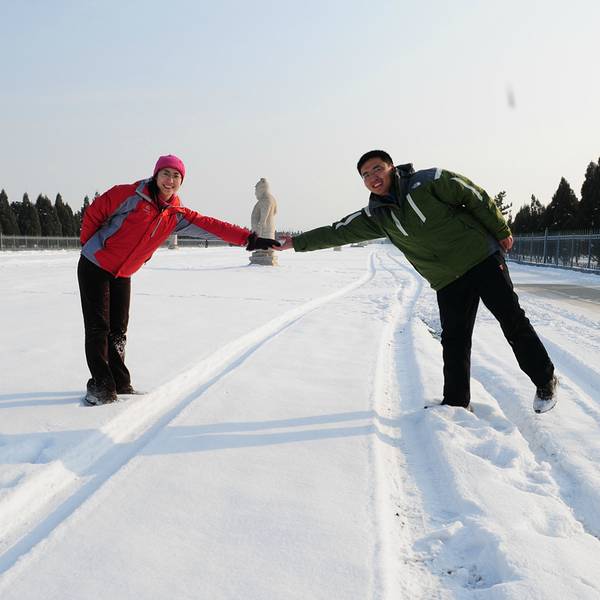 还没正式进入景区前,看到地上积满皑皑白雪,一行三人就兴奋起来,现在雪地上拍照打闹上了。