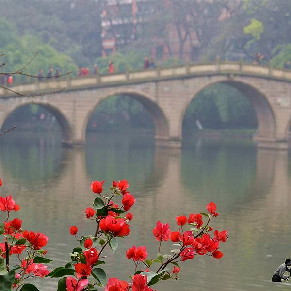 碧津公园是一处免费的市民休闲公园,位于渝北区两路城中心,毗邻重庆江北国际机场T2航站楼,从T2航站楼坐轻轨到碧津公园只有1站。公园是典型的中式园林风格:湖光山水、水榭亭台、七孔石桥、宝塔等错落有致。公园内还有爱国主义教育内容的相关浮雕和塑像,以及展示巴渝民俗风情的“巴渝民俗博物馆”和“巴渝古床博物馆”(免费),还有一座清朝光绪年间的贞节牌坊(非常精美)和观音庙。 公园里有休闲散步、踏青赏花、锻炼的人们,也有三五成群自娱自乐弹唱的音乐爱好者, 跳广场舞的大妈,还有儿童乐园里欢乐的孩子。实在是城市中人们远离喧嚣、放松心情的好去处。