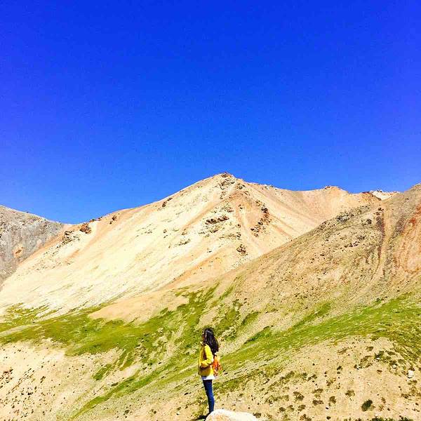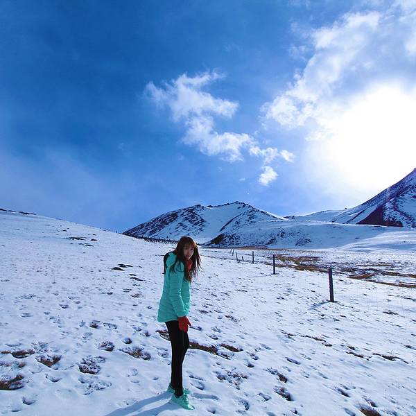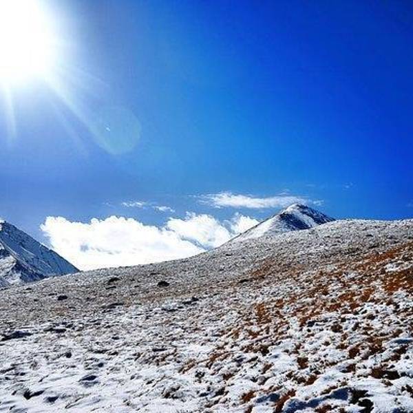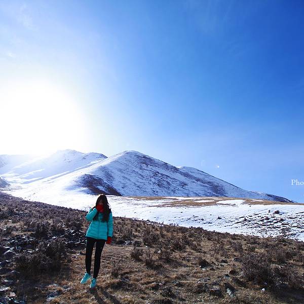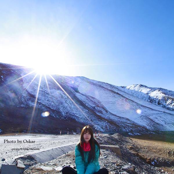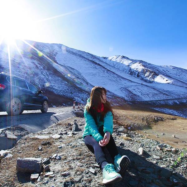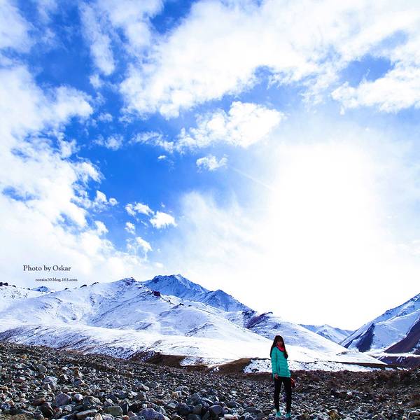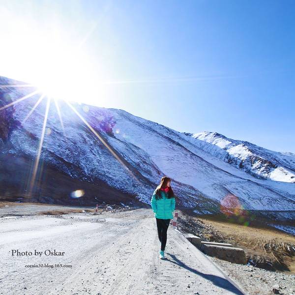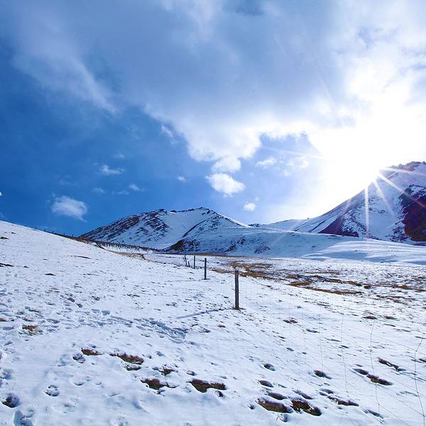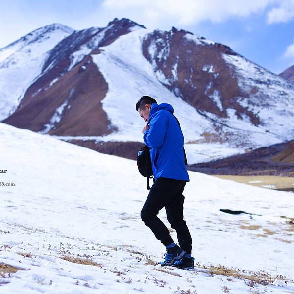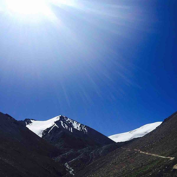 师傅人不错,主动提出,带我们去周围几座山峰看看。ok那就走吧,其实一路过来的风景已经震撼住了我们的心灵,及时不爬4600m的主峰,我们也不觉得有遗憾了。师傅也是蛮拼的,这种石头路,居然一路开进来,真担心轮胎会被扎破。老公一路就在夸自己这鞋怎么怎么赞,不过说实话的确,登山,玩雪和之后的沙漠,全靠它了吼吼,太阳出来了,因为这里离景区大门不远,山上有一座太阳能手机信号站,这里居然有信号哦,哈哈,果断朋友圈刷屏和好友们分享起来了山脚的草地上,有一户牧民,他们家的狗老远看到我们就开始狂叫,我们以为是藏獒,生怕他会冲过来,把我们吓的不轻,不过还好,他看我们没有继续靠近的意图,也就作罢了除了爬的快一点会有些喘以为,我似乎没有然后不良的高原反应啊,还是值得庆幸的,老公说他有点想吐,但不是因为高原的关系,而是一路上车实在颠的让他受不了这2张好喜欢哦,太阳的光芒正好被一片云遮住了,有没有感觉像在外星球,哈哈