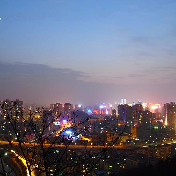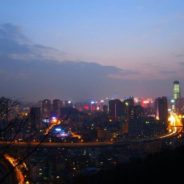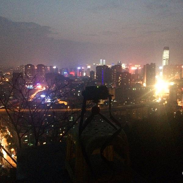 出了公园看到路边小摊很有意思,应该是坐下来吃手撕豆腐的地方。之前在网上查到如果要去贵阳看夜景的话就去仙人洞,离市区不远的一座小山上。这里有公交直达,不过下车后要走很长的街道才能到。到了以后看大门关了,说下班了,不过门没锁就直接进去了。山城这边有可以爬到更高地方的路,不过应该是下班时间,底下的门封上了。财神殿是晚上最合适拍夜景的地方了。即将进入夜色的贵阳。前面有个台子,正好把相机放在上面。夜贵阳。感觉又看到了苗寨一样。明天坐飞机要回去了,所以今天先去了超市买特产,带回去给家里人。