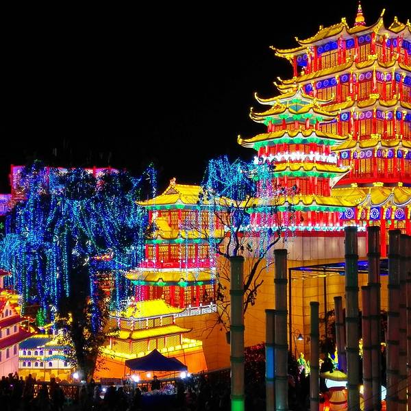 自贡彩灯公园位于自贡老城区的中心。周边的景点:盐业历史博物馆、王爷庙、桓侯祠等都离彩灯公园很近,步行约5-10分钟。每年,自贡著名的国际恐龙灯会都在此举办。因此,每年春节的时候,也是这里最拥堵的时候,自驾车的游客基本找不到停车位,附近大街小巷各处角落都停满了车。而且周边还要限行。并且,春节灯会期间,整个彩灯公园灯会现场都是人山人海的。 灯会期间,彩灯公园有四个门,分为一号门、二号门、三号门、四号门。从盐业历史博物馆走路过来最近的入口是四号门,路上经过桓侯祠后,一路上坡,约10分钟就到门口。门口有安保,带包的游客要被检查包包。 晚上彩灯开灯时间是18:30——22:00.除夕之夜闭灯。 春节期间,灯会的门票是100元。里面还有很多收费的项目,比如,想在水道里穿行近距离看彩灯,30元一人。游乐场区高高的塔,里面是哈尔滨冰雪大世界,每人60元。其他还有很多。会场还是较大,中间的水池是主要景观,进园区后,可以顺着绕一大圈。今年有个法国区,全部都是各种法国的元素造型,比如埃菲尔铁塔、凯旋门、法国女郎、香槟、甚至还有蒙娜丽莎的微笑的画像造型灯组。非常漂亮。水中的彩灯倒影。宏大壮观精美的亭台楼阁造型。