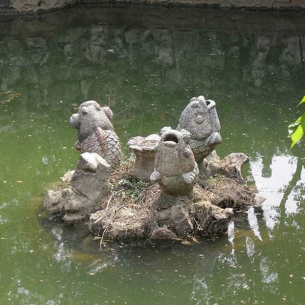东坡园大门上的门环与众不同,其形似虎,名曰狴犴,相传是龙的第七个儿子。半亭屋脊两端的卷尾龙头,名叫螭吻,相传是龙的第九个儿子。狴犴能明辨是非,急公好义,有威慑力,而螭吻属水性,能克火,装在屋脊两端既美观,又能灭火消灾。 常州 人特以龙子护门,日夜守护先生正气。进入洞门,迎面白墙分隔为抑景、洞门作框景、漏窗为借景,并以廊相连,配以松石花木,层次有致。这组湖石小品,名曰“三苏苑”。虽只方寸,但小中见大。乍看之下,好似 泰山 、 华山 之缩影。主峰高耸,次峰拱奉,前后错落,构成了一幅优美的立体图画。而细看之中,又暗合东坡“细观烟雨三峰外,都在灵仙一掌间”的意境。主峰后的松、梅、竹为“岁寒三友”,与前面这三座湖石相呼应,隐寓“一门三父子,文章四大家”的苏洵、苏轼、苏辙父子三人。