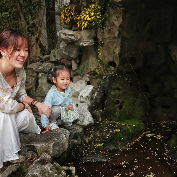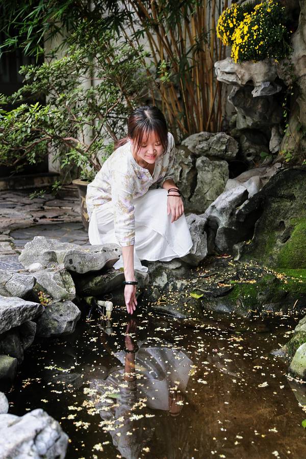 我们惊叹于这一处小景的时候,暖暖开始玩水。我这才发现原来头顶还有一棵桂树,洒落一地一池金桂。