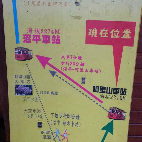 2. 从时间和花费考虑,个人建议是:搭祝山线看日出,祝山线回沼平车站,然后徒步从沼平车站沿下车步道走回阿里山车站,既可以看日出,又能节省时间把时间花在主要的景点上。如果乘祝山线直接回阿里山车站,那么会错过姐妹潭和巨木群等景点。
