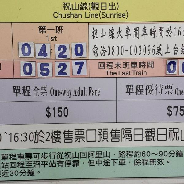 1. 祝山车站位于海拔最高处,看日出的最佳地点。而祝山线火车班次一般都很早就开,然后6点左右基本就停开了,所以想坐小火车上山的游客一定要注意时间。搭乘阿里山小火车到祝山车站单程一人150NT,如果中途从沼平车站下车了,那么很抱歉,再上车到祝山车站要另交150NT,跟地铁不一样。