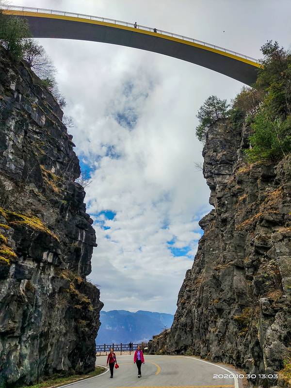 这样也叫景点,实在太牵强!公路穿过垭口,仰望天空,一座虹桥凌空飞架悬崖壑口,像一道彩虹悬挂在天穹8月11日,从住地出发,经过红坪镇,前行几公里就到天燕景区。