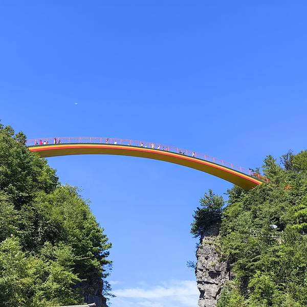 前面的燕子垭主要打卡点是飞云渡,俗称彩虹桥。公路穿过垭口,仰望天空,一座虹桥凌空飞架悬崖壑口,像一道彩虹悬挂在天穹。气势恢宏,景观漂亮。这是一座钢结构观景桥,悬空高,跨度大,因此又得名云天飞渡。我们从入口沿着栈道上行,经过燕子洞,蜿蜒曲折地爬上崖头,彩虹桥就横卧在眼前。跨上彩虹桥,茫茫林海尽收眼底。过桥后继续前行可到会仙桥、野人洞等景点。我们直接右转向出口,拾级而下回到地面。客观地说,燕子垭是天燕景区唯一可玩点。莽莽林海天门垭彩虹桥栈道俯瞰桥面步道 展开