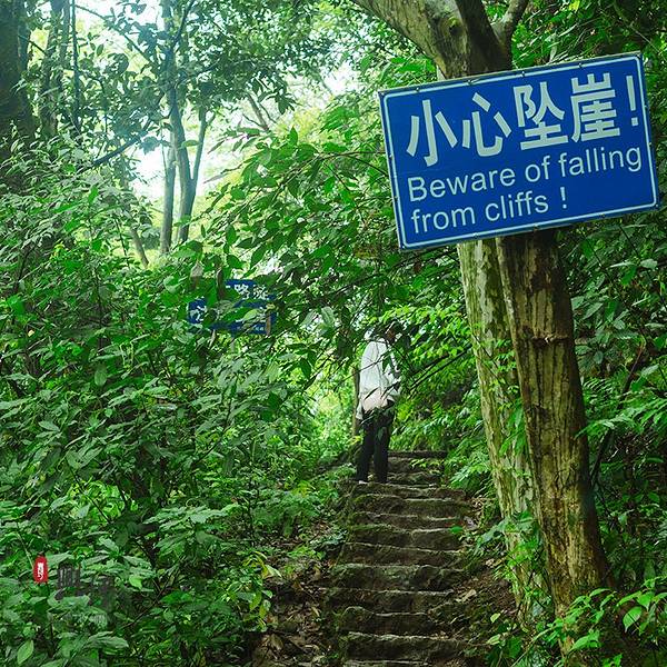 山路还是比较湿滑,每一步都要小心。老寨山路边不断有提示牌提醒大家注意安全,看的我心惊胆战的,路上人不多,老外居多,后面阳朔老外更多。老寨山爬了近三分之一的路程,云爬不动了,在原地等我,我已经爬到一半不甘心就这样放弃,坚持着爬上去,路上会经过一个拱形洞门,然后上去有个90°直角铁梯,这个有点吓人,幸好长度不长,下来的时候最好是跟上去一样的动作下来,就不那么害怕。过了铁梯,很快就到山顶,有一个小亭子。