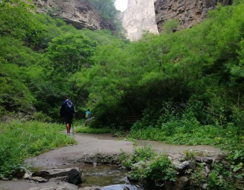 龙门涧风景区位于北京市门头沟区西部清水镇,距市中心约100公里。这里虽然开发于2000年,不知为何,至今没有一点商业气息。我们进山沿着山泉水一直徒步行走了四公里,道路很平,基本没有台阶,进山出山只有这一条路,也没见有当地的人,是个非常安静/清新/凉爽的徒步之地。四周都是刀削斧砍般的巨石峡谷,属于岩溶峰林地貌,被誉为:"北方喀斯特之花"。峡谷蜿蜒曲折,千回百转,犹如一条虬龙,匍匐山间,路边始终泉水相伴,绿色的植被很茂盛,到处是野山花,空气格外的清新,沿着平坦的山路可以徒步15公里。山间的凉爽和清新,是久居城市人来采集地气,休闲徒步的必选之地。