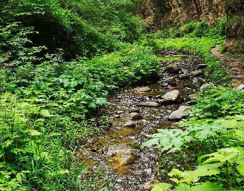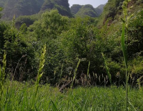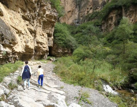 实际是一条窄山沟,两旁山峰耸立,沟内一条溪蜿蜒流淌,树少,两旁山长满艾蒿绿油油的。全家游孩子们会喜欢