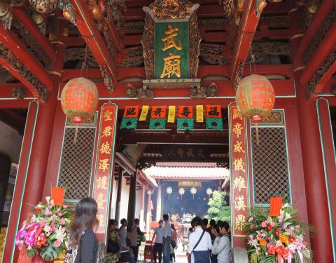 武庙也叫祀典武庙,就在赤崁楼对面的巷子里,主祭关公,所以是武庙武庙也叫祀典武庙,就在赤崁楼对面的巷子里,主祭关公,所以是武庙。但除了关公外,还祭观音、祭月老,台南的百姓要祈求身体健康或是想求一段好姻缘都会来这里拜拜