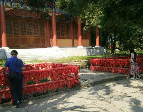 ...泉眼,据说是文殊菩萨两指插石而形成的,泉水清澈,终年不溢不涸,周边护栏上都是信众留下的祈福丝带