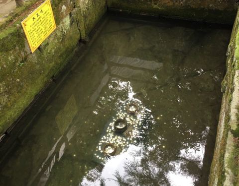 实际是两口位于天池寺大殿前的泉眼,据说是文殊菩萨两指插石而形成的,泉水清澈,终年不溢不涸,周边护栏上都是信众留下的祈福丝带。