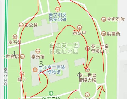 5.经过本人数次折反跑的惨痛教训,强烈建议游览顺序为下图1.离曲江池很近,挺好找的,周围都是小区,很安静。 2.遗址本身免费的,里面有个博物馆收费,分为秦殇(秦兴衰的历史)和曲江新区建设过程中发现的文物展,蹭着解说看完了,很涨姿势,个人觉得还是值得一去,全...1.离曲江池很近,挺好找的,周围都是小区,很安静。 2.遗址本身免费的,里面有个博物馆收费,分为秦殇(秦兴衰的历史)和曲江新区建设过程中发现的文物展,蹭着解说看完了,很涨姿势,个人觉得还是值得一去,全价票20也不贵。 3.最佳参观时节应该是10-11月,满园的银杏很漂亮,霜叶也红了,单单是来看银杏林都是个不错的去处了。同时这秋色的寂凉萧瑟和遗址主题十分契和,更突出了秦殇和覆舟之鉴。 4.胡亥墓不大,从封土即可看出和他老爹差五六档,毕竟只是社会我赵哥的傀儡,没啥成就也没啥地位,以黔首之礼(老百姓地位)草草埋藏。 5.经过本人数次折反跑的惨痛教训,强烈建议游览顺序为下图。 展开