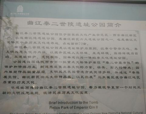在曲江池南边,有人很少,很肃静。二世墓相比秦皇墓就太小了,遗留的原物件也就剩三堆夯土和几个石雕。秦殇博物馆收费,不过可以用旅游年卡,讲解机押金200收费20,展出物件比较少。整体规模不大,可以和曲江池、寒窑一天逛完。