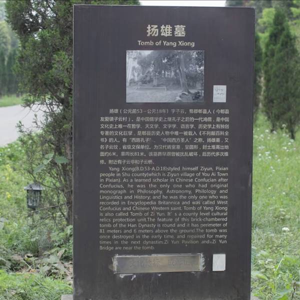 扬雄,汉代著名文学家、哲学家、语言学家,也是国内学者公认的与孔孟齐名的大儒,与司马相如均以辞赋名贯巴蜀,至今在东南亚地区还有广泛影响。扬雄生长于郫县,在今郫县友爱乡子云村有扬雄墓遗迹,供后人凭吊。扬雄墓为一圆形封土堆,封土堆上植柏树数百株,现已列为成都市市级重点文物保护单位。在扬雄墓附近,还有唐代文学家刘禹锡《陋室铭》中盛赞的“西蜀子云亭”遗迹。