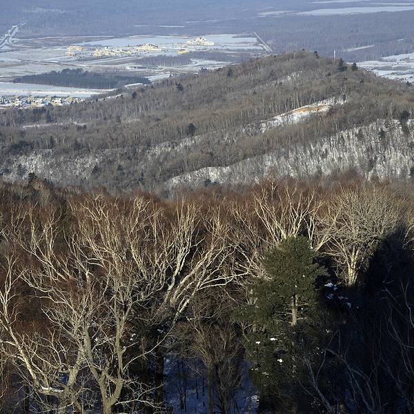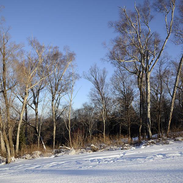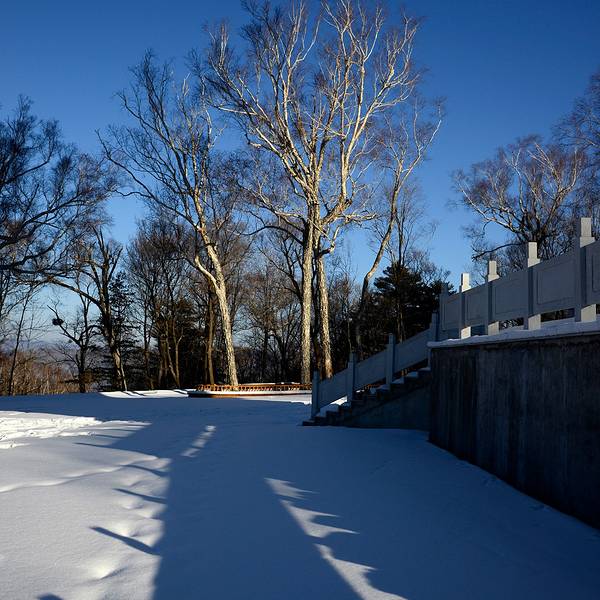 今天时间充裕,打算一早去日月峡滑雪场转转。听人说这里的太阳升起的晚,我们也没起太早,,6:45才爬起来。早餐吃了包子面条和粥,8:00开车去滑雪场。昨天温度低,有零下二十几度,我们的车打了好几下才打着火。 日月峡滑雪场离我们住的地方不远,也就几百米的样子,没开几分钟就到了,要是走路估计就十几二十分钟。因为早,上山的缆车没开。旅店老板把我们带进来,我们只是看看风景,不滑雪,就没跟我们要门票。滑雪场顶部有个观景亭,可以俯瞰整个日月峡的风景。 滑雪道不算高,我们没等缆车,直接走上去了,有几个坡还真陡,娟娟和月民戴上了冰爪,好爬多了。这里的雪真干净啊!踩在脚下软软的,跟北京的人造雪还真是不一样。