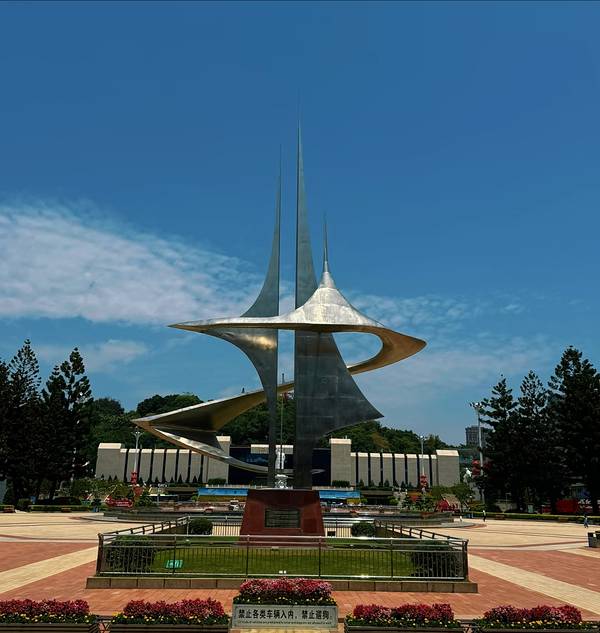 除却厚重的人文底蕴,广场的景致设计兼具审美与巧思,秋冬时节虽无盛夏的繁花盛景,却有别样的清朗之美。中轴线上的八花瓣音乐喷水池,池边八尊少女雕塑翩然灵动,寓意八闽大地祥和,秋冬虽暂别喷泉喷涌的灵动,阳光洒在洁白雕塑与池面,光影交错间,成了游人打卡、孩童嬉戏的好去处;喷水池后方的“三山一水”不锈钢雕塑是广场点睛之笔,三根金属柱代表于山、乌山、屏山,环绕流线象征闽江,抽象设计将福州“城在山中,山在城中”的城市格局凝于一方,与北侧于山的白塔遥遥相望,山水城相融的意境在此尽致展现。广场内3万多平方米的绿地更是城市绿肺,南洋杉、古榕、蒲葵、白玉兰错落种植,7000多株绿植让秋冬的广场依旧绿意盎然,偶有金黄落叶飘落在草坪与石板路上,添了几分浅秋韵味,却无半分萧瑟,微风拂过,榕叶轻摇,清新的草木气息扑面而来。