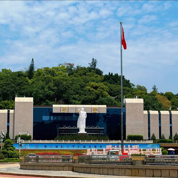 五一广场的核心魅力,首在其不可替代的城市符号意义,这份厚重感在秋冬晴日里更显动人。广场北侧的国旗台庄严肃穆,汉白玉台基搭配30米高旗杆,钛金圆球在澄澈的蓝天下熠熠生辉,作为全国唯二每日升国旗的城市广场,清晨的升旗仪式是这里独有的仪式感——晨曦微露时,国歌奏响,国旗冉冉升起,周遭人群肃立,家国情怀在微凉的秋风中悄然涌动。旗台旁的毛主席塑像昂首伫立,骏马雕塑相伴,红墙绿树相映,让这片区域成为福州红色底蕴的重要载体,而钛金圆球199.7公斤的重量设计,更是藏着纪念香港回归的巧思,一砖一瓦皆有深意。这份庄重与温情,让五一广场超越了普通休闲场所,成为镌刻着城市记忆的精神地标。
