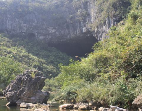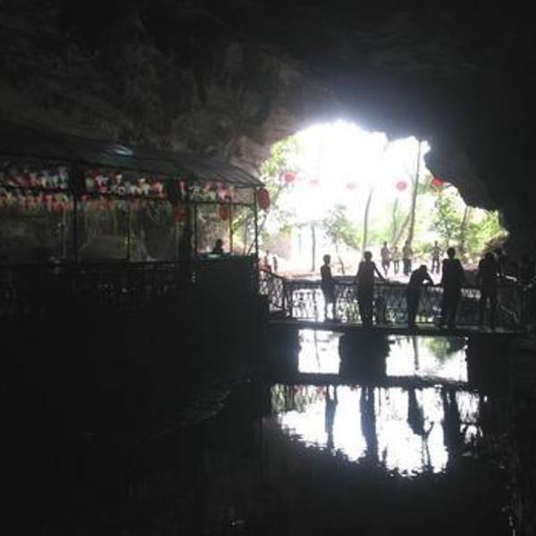 我们在兴安住了一夜,第二天一早乘中巴车来到城南出城几公里的龙蟠山下,找到了这个乳洞。洞里有一个水渠。这一带并没有开发成景点,因此也没有游客。风景还不错。从山的一头进去,另一头出来。洞里的水渠那一段还有点小陡坡,不过因为没有游人,所以玩得很尽兴。