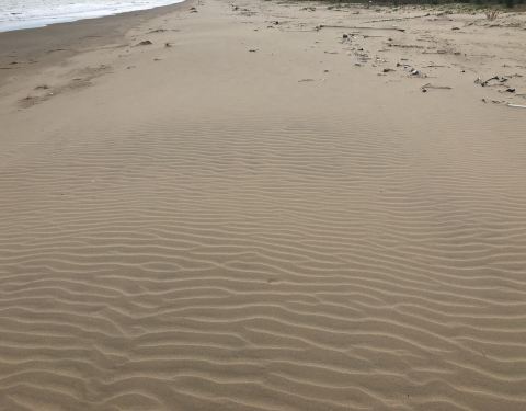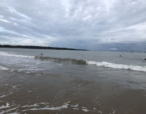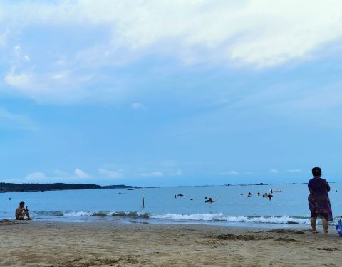 刚去回来,海滩沙子软,但是脏,我们下海游泳了,浪拍打可以,游泳不舒服,有蚊子东西咬的感觉,听周围说是水母的唾液分泌出来造成的