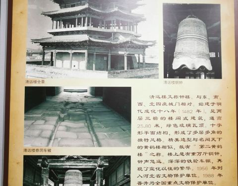 拿身份证免费参观。清远楼是一座重檐多角十字脊歇山顶木结构建筑,建筑风格独特,是我国古代建筑瑰宝清远楼是一座重檐多角十字脊歇山顶木结构建筑,建筑风格独特,是我国古代建筑瑰宝。 清远楼也叫钟楼,在宣化城中心,建于明成化十八年(1482年),楼内有明嘉靖十八年铸八卦铜钟一口,钟高2.5米,钟声洪亮,悠扬...清远楼是一座重檐多角十字脊歇山顶木结构建筑,建筑风格独特,是我国古代建筑瑰宝。 清远楼也叫钟楼,在宣化城中心,建于明成化十八年(1482年),楼内有明嘉靖十八年铸八卦铜钟一口,钟高2.5米,钟声洪亮,悠扬,可远传四十里外。 拿身份证免费参观。 展开