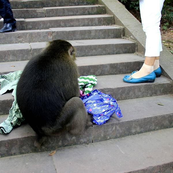 一定要听劝!峨眉山的猴子超“热情”🐒。千万别用塑料袋,我们换成帆布袋,不然塑料袋声就是猴子召唤术!双肩包反背胸前,零食手机藏好📱。遇到卖竹竿的小贩,果断租根“防猴神器”,安全感直接拉满🔝!