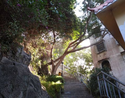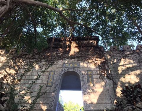 从白鹿洞寺到鸿山公园,其实是沿着一路上坡的白鹿路上行,走了七八分钟也就到了。又走了几分钟到了鸿山公园顶上,这里可以远眺鼓浪屿。半山处是鸿山寺,一群退休老人围成一圈唱着歌,欢声笑语不断。三角梅,厦门市市花。从公园北侧下山,道旁榕树。一座奇特的亭子,该方向通往鸿山寺和思明南路。我们因为要去北侧的中山路,所以从北边的小门出,然后左转到了思明南路。