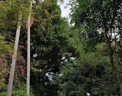 从白鹿洞寺到鸿山公园,其实是沿着一路上坡的白鹿路上行,走了七八分钟也就到了。从公园北侧下山,道旁榕树