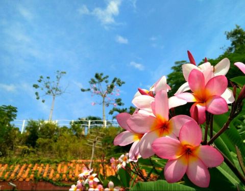 从白鹿洞寺到鸿山公园,其实是沿着一路上坡的白鹿路上行,走了七八分钟也就到了。又走了几分钟到了鸿山公园顶上,这里可以远眺鼓浪屿。半山处是鸿山寺,一群退休老人围成一圈唱着歌,欢声笑语不断。三角梅,厦门...